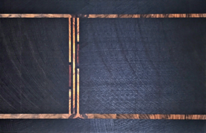 Ein Stirnholzbrett aus Wenge, Teak und Eibe. Stirnholz ist durch seine mit der Schnittrichtung laufenden Fasern besonders schnittfest und schont dadurch zudem die Schneiden der Messer.